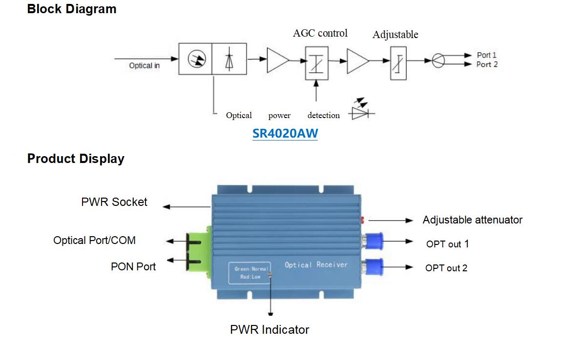 SR4020AW optical receiver is a home optical receiver with optical fiber access as its ultimate goal. It is suitable for FTTH (fiber to the home) network fiber subscriber access terminals, enabling analog or digital signals to enter the home. The machine uses low-power photodetectors, GaAs, and optical AGC technology to meet the fiber-to-the-home CATV reception needs. This device can increase WDM and achieve triple play.